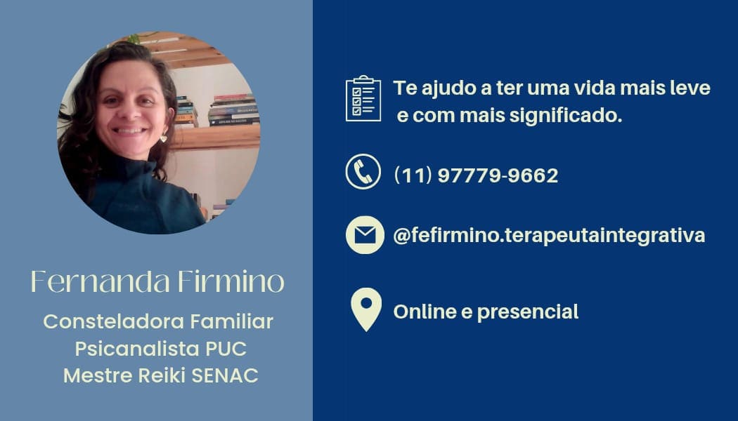 A Fernanda Firmino é terapeuta integrativa especializada em Constelação Familiar, Psicanálise e Reiki, oferecendo atendimento presencial na Vila Yara, em Osasco e consultas online para todo o Brasil.